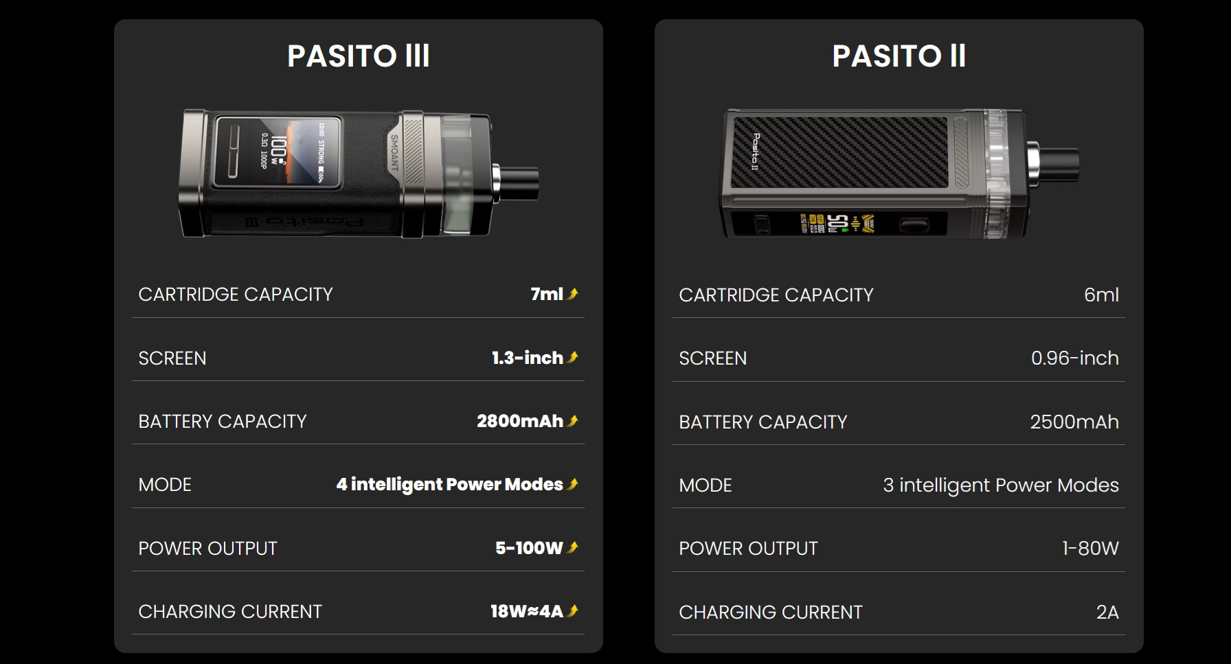Компания Smoant представила свой новый продукт. Долгожданный Pasito 3 предложил пользователям знакомый, но в то же время переработанный дизайн, увеличенный запас автономности и новый картридж на 7мл емкости. Батарейный блок под-системы оснащен встроенным источником питания, емкость которого составляет 2800 мАч. Зарядка осуществляется током до 4А по Type-C. Гаджет имеет умную плату, который выдает мощность в диапазоне 0т 5 до 100 Ватт, а также обладает четырьмя предустановленными режимами парения: Strong, Norm, Soft и DVW. Устройство оснащено Bluetooth, который используется для передачи настроек с другого устройства.Характеристики: